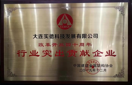 2019年12月2日,在北京国家会议中心召开的中国建筑金属结构协会第十一次会员代表大会暨第十一届理事会一次会议上。经过专家评审评定,大连实德科技发展有限公司被评为中国建筑金属结构行业改革开放四十周年“突出贡献企业”,许志伟总裁被评为中国建筑金属结构行业改革开放四十周年“功勋人物”。